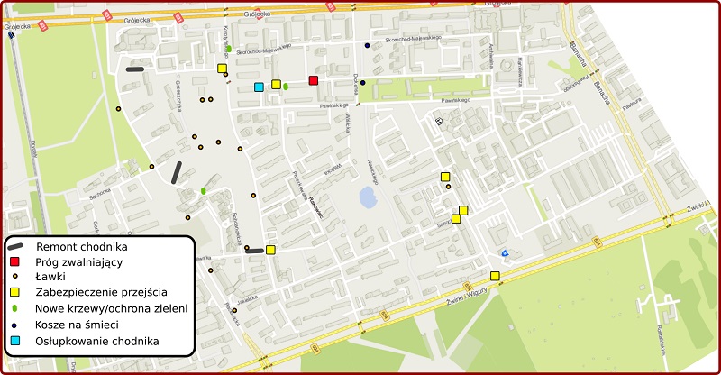 Projekt składa się z wielu usprawnień dla pieszych na całym Rakowcu, m.in.: - remonty chodników przy Mołdawskiej, Racławickiej, Sierpińskiego, - zabezpieczenia przejść dla pieszych (Korotyńskiego, Siemieńskiego, Trojdena, Sierpińskiego), - postawienie 18 ławek, głównie przy Racławickiej, Korotyńskiego i w parku Forty, - dodatkowy próg zwalniający k.szkoły na Siemieńskiego, - dodatkowe kosze na śmieci na zieleńcu wzdłuż Dickensa, - rekultywacja trawnika przy ul. Bohdanowicza, - przedłużenie pasa zieleni wzdłuż ul. Korotyńskiego przy skrzyżowaniu z ul. Majewskiego.
